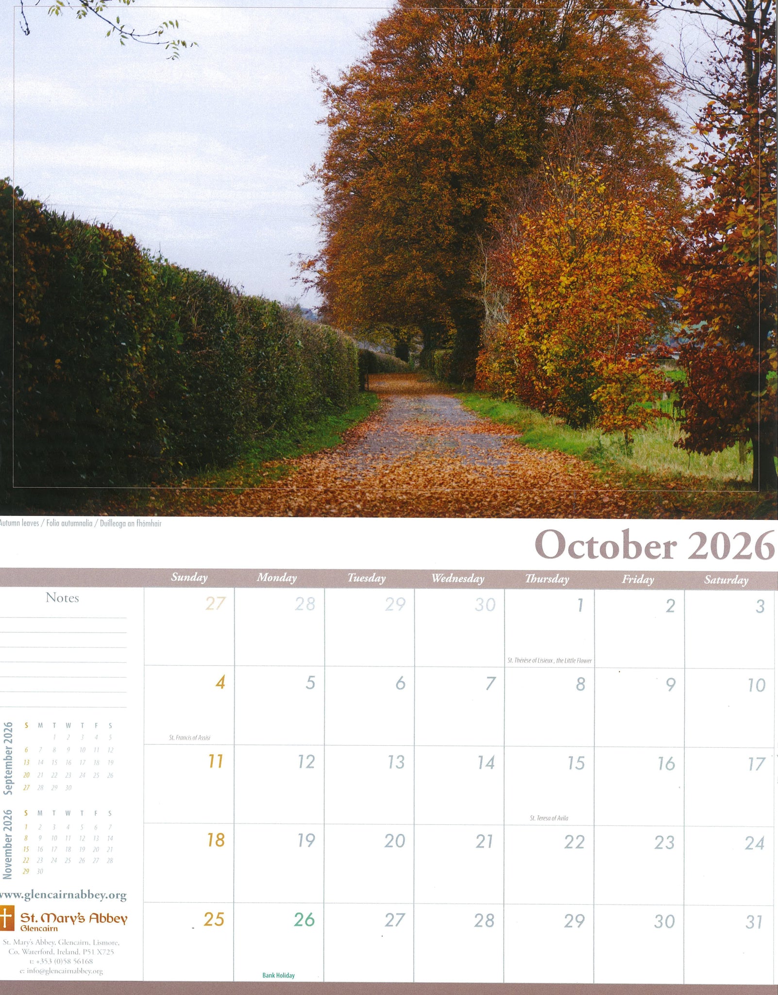 Produced by the Sisters in our Card Department using eco-friendly materials, this large spiral-bound wall calendar features a delightful selection of photos taken by Sr Michelle Miller while out and about in the grounds of Glencairn in all seasons.